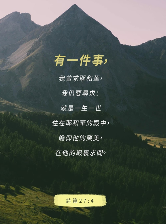 有一件事,我曾求耶和华,我仍要寻求:就是一生一世住在耶和华的殿中,瞻仰祂的荣美,在祂的殿里求问。【诗篇27:4】