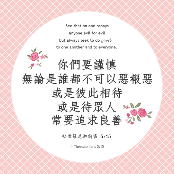 你们要谨慎,无论是谁都不可以恶报恶;或是彼此相待,或是待众人,常要追求良善。【帖撒罗尼迦前书5:15】