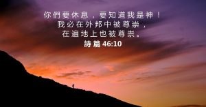 你们要休息,要知道我是神。我必在外邦中被尊崇,在遍地上也被尊崇。【诗篇46:10】