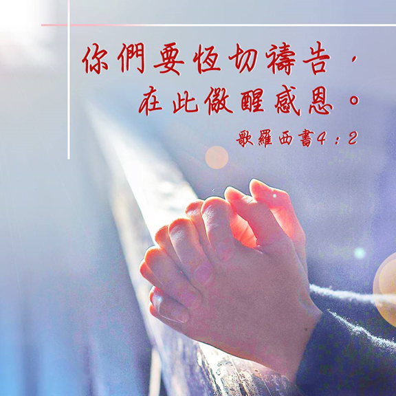慈爱的天父啊,愿我们在祢的施恩宝座前,时时恒切、儆醒、感恩,让祷告不但在我们口里,也在我们的心里,并实行在我们的生活里。