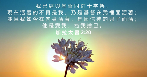 我已经与基督同钉十字架,现在活着的不再是我,乃是基督在我里面活着;并且我如今在肉身活着,是因信神的儿子而活;祂是爱我,为我舍己。【加拉太书2:20】