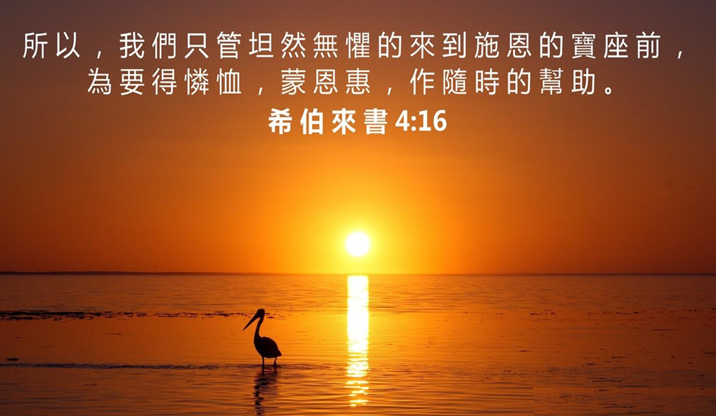 所以,我们只管坦然无惧地来到施恩的宝座前,为要得怜恤,蒙恩惠,作随时的帮助。【希伯来书4:16】