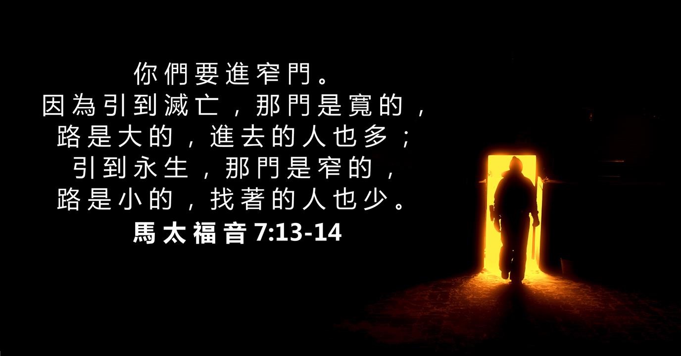 你们要进窄门。因为引到灭亡,那门是宽的,路是大的,进去的人也多;引到永生,那门是窄的,路是小的,找着的人也少。【马太福音7:13-14】