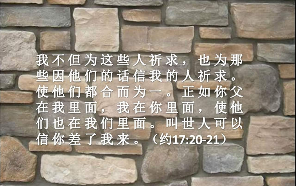 我不但为这些人祈求,也为那些因他们的话信我的人祈求,使他们都合而为一。正如你父在我里面,我在你里面,使他们也在我们里面,叫世人可以信你差了我来。你所赐给我的荣耀,我已赐给他们,使他们合而为一,像我们合而为一。【约翰福音17:20-22】