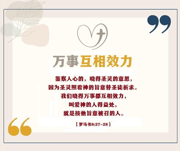 鉴察人心的,晓得圣灵的意思,因为圣灵照着神的旨意替圣徒祈求。我们晓得万事都互相效力,叫爱神的人得益处,就是按他旨意被召的人。【罗马书8:27-28】