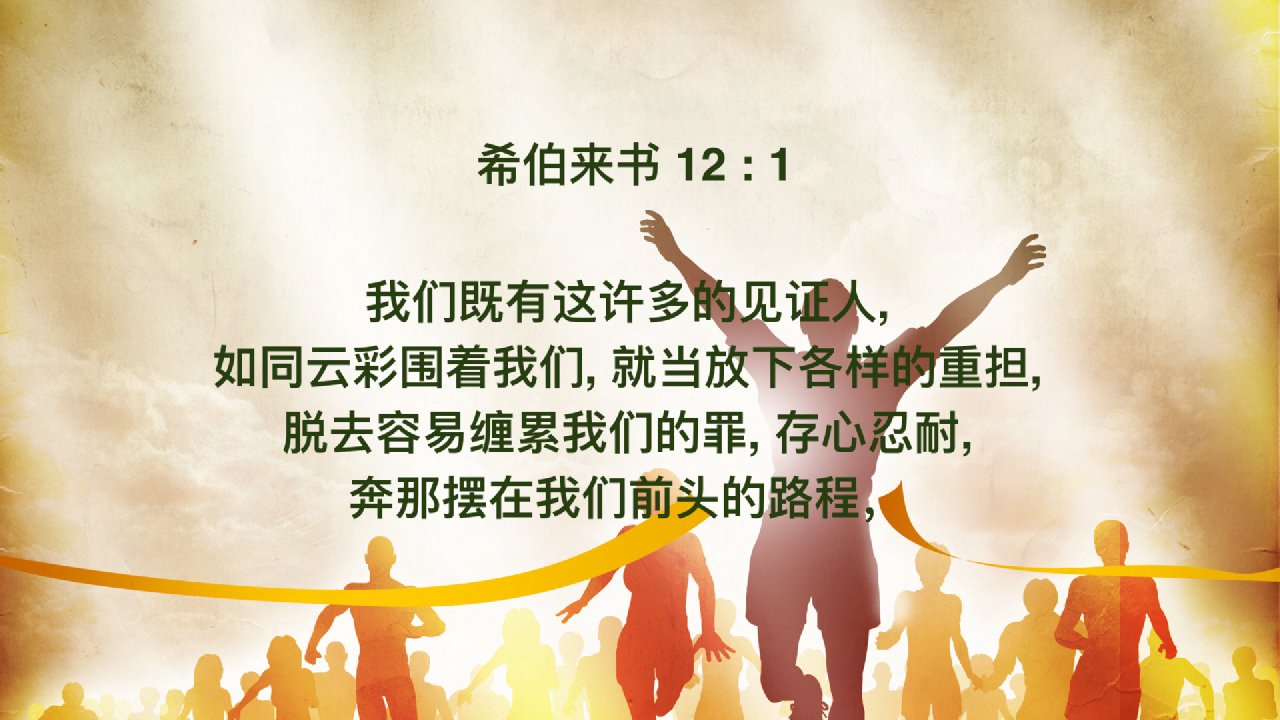 我们既有这许多的见证人,如同云彩围着我们,就当放下各样的重担,脱去容易缠累我们的罪,存心忍耐,奔那摆在我们前头的路程,仰望为我们信心创始成终的耶稣。【希伯来书12:1-2上】