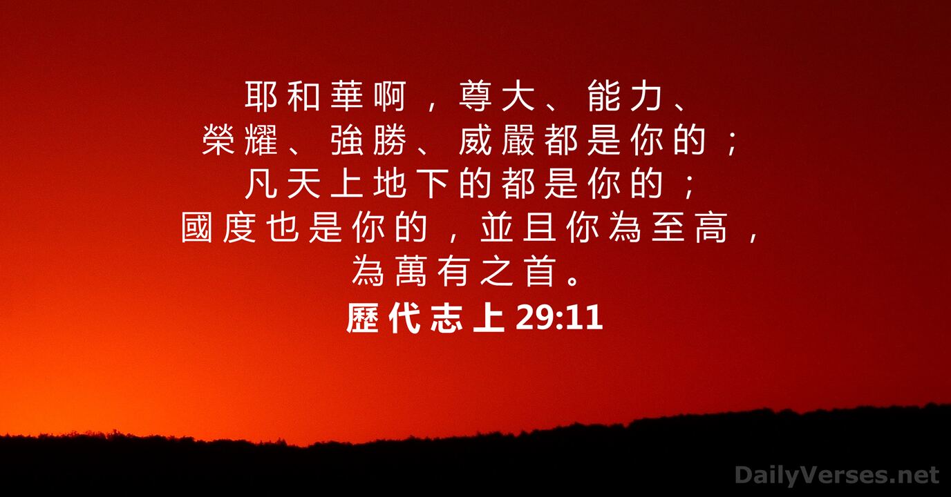 耶和华啊,尊大、能力、荣耀、强胜、威严都是祢的;凡天上地下的都是祢的;国度也是祢的,并且祢为至高,为万有之首。【历代志上29:11】