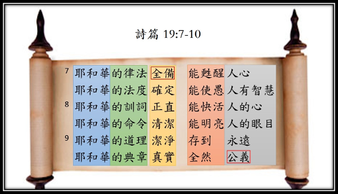 耶和华的律法全备,能苏醒人心;耶和华的法度确定,能使愚人有智慧。耶和华的训词正直,能快活人的心;耶和华的命令清洁,能明亮人的眼目。耶和华的道理洁净,存到永远;耶和华的典章真实,全然公义。都比金子可羡慕,且比极多的精金可羡慕;比蜜甘甜,且比蜂房下滴的蜜甘甜。【诗篇19:7-10】
