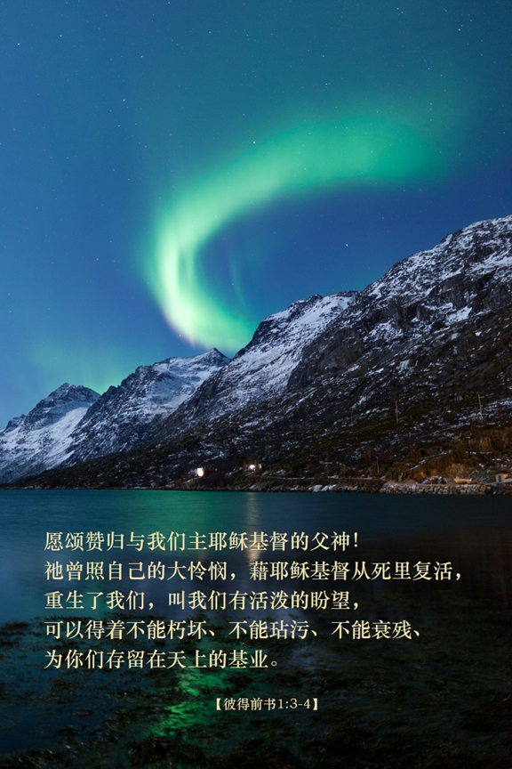 愿颂赞归与我们主耶稣基督的父神!祂曾照自己的大怜悯,藉耶稣基督从死里复活,重生了我们,叫我们有活泼的盼望,可以得着不能朽坏、不能玷污、不能衰残、为你们存留在天上的基业。【彼得前书1:3-4】