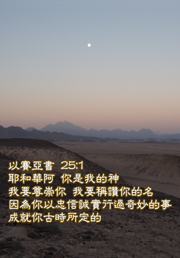耶和华啊,祢是我的神;我要尊崇祢,我要称赞祢的名。因为祢以忠信诚实行过奇妙的事,成就祢古时所定的。【以赛亚书25:1】