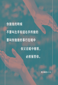 你施舍的时候,不要叫左手知道右手所做的,要叫你施舍的事行在暗中。你父在暗中察看,必然报答你。【马太福音6:3-4】
