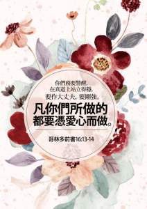 你们务要儆醒,在真道上站立得稳,要作大丈夫,要刚强。凡你们所做的都要凭爱心而做。【哥林多前书16:13-14】