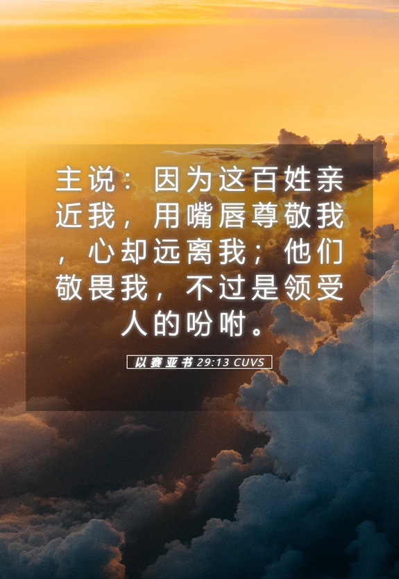 主说:因为这百姓亲近我,用嘴唇尊敬我,心却远离我;他们敬畏我,不过是领受人的吩咐。【以赛亚书29:13】