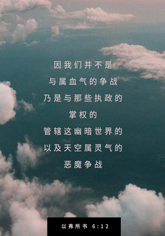 因我们并不是与属血气的争战,乃是与那些执政的、掌权的、管辖这幽暗世界的,以及天空属灵气的恶魔争战。【以弗所书6:12】