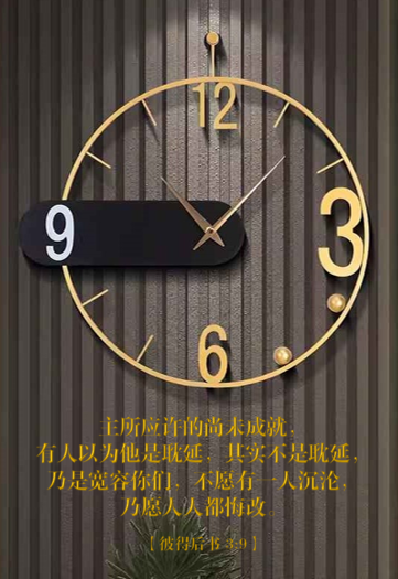 主所应许的尚未成就,有人以为祂是耽延,其实不是耽延,乃是宽容你们,不愿有一人沉沦,乃愿人人都悔改。【彼得后书3:9】