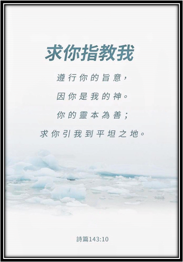 求祢指教我遵行祢的旨意,因祢是我的神。祢的灵本为善;求祢引我到平坦之地。【诗篇143:10】