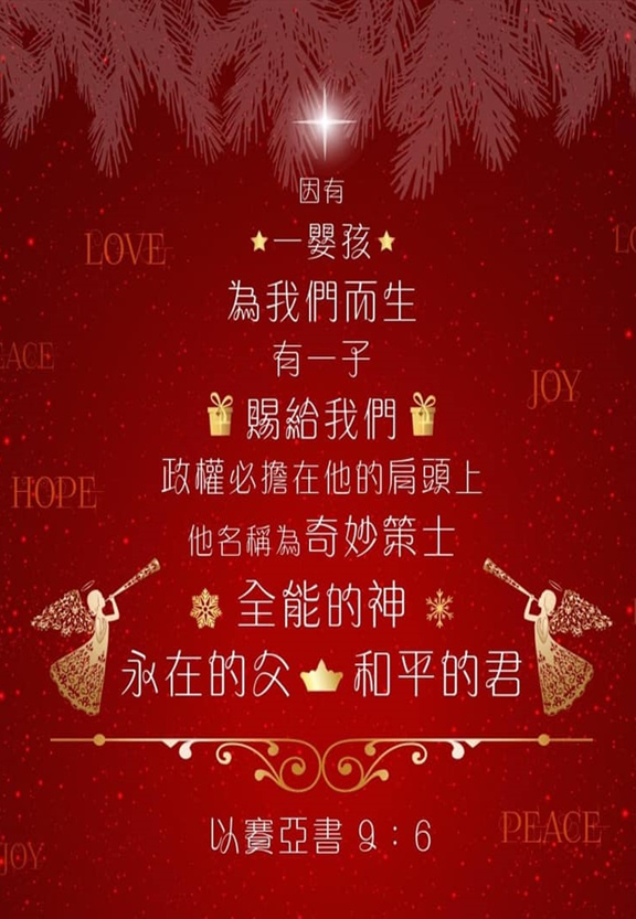 因有一婴孩为我们而生;有一子赐给我们。政权必担在他的肩头上;他名称为奇妙策士、全能的神、永在的父、和平的君。【以赛亚书9:6】